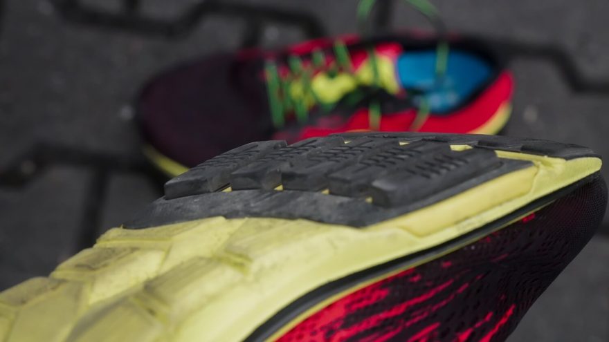 Podešev vás hned na první pohled zaujme hodně netradiční konstrukcí. V přední části, konkrétně v oblasti příčné klenby, najdeme 5 výstupků ve směru zánártních kůstek. Tento systém má za úkol rychle převést chodidlo z dopadové do odrazové fáze a běžce pokaždé trochu nakopnout. Hezká myšlenka, která ale funguje jen u zkušenějších jedinců, kteří běhají v naprosté většině přes přední část chodidla. Co se týče směsi, ze které je pryž vyrobena, na podrážce je použita velmi přilnavá měkká guma, výborně drží i na mokrém asfaltu. Nicméně už po pár výbězích pozoruju lehké opotřebení, což mě utvrzuje v tom, v botách vybíhat jenom při specifických příležitostech a trénincích (nebo závodech…).
